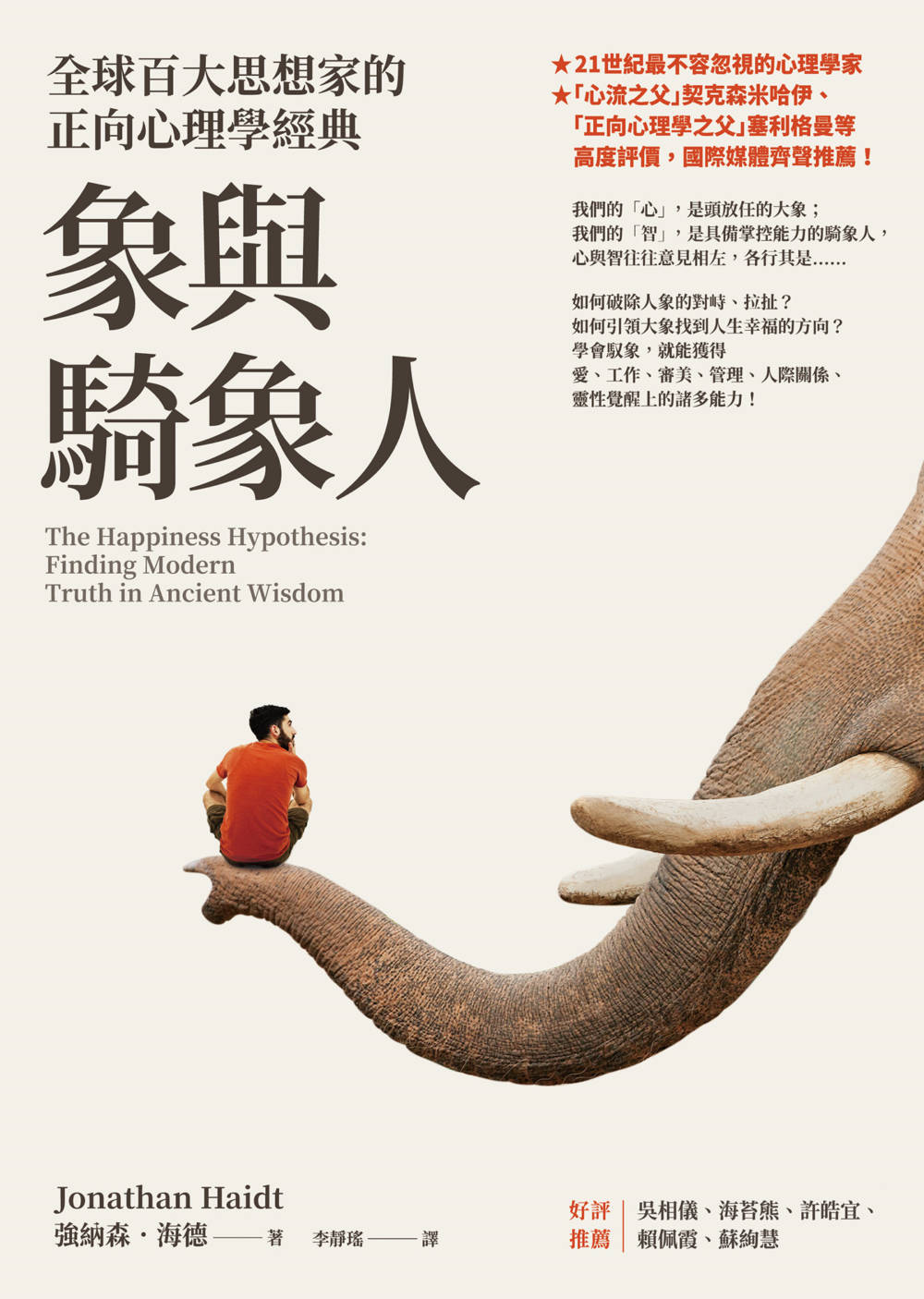 其中「象」與「騎象人」比喻更是精妙絕倫,我這輩子大概忘不掉這個比喻。書中想表達的是,只有當大象跟騎象人能協調時,我們生活才會比較順遂,並感受幸福。