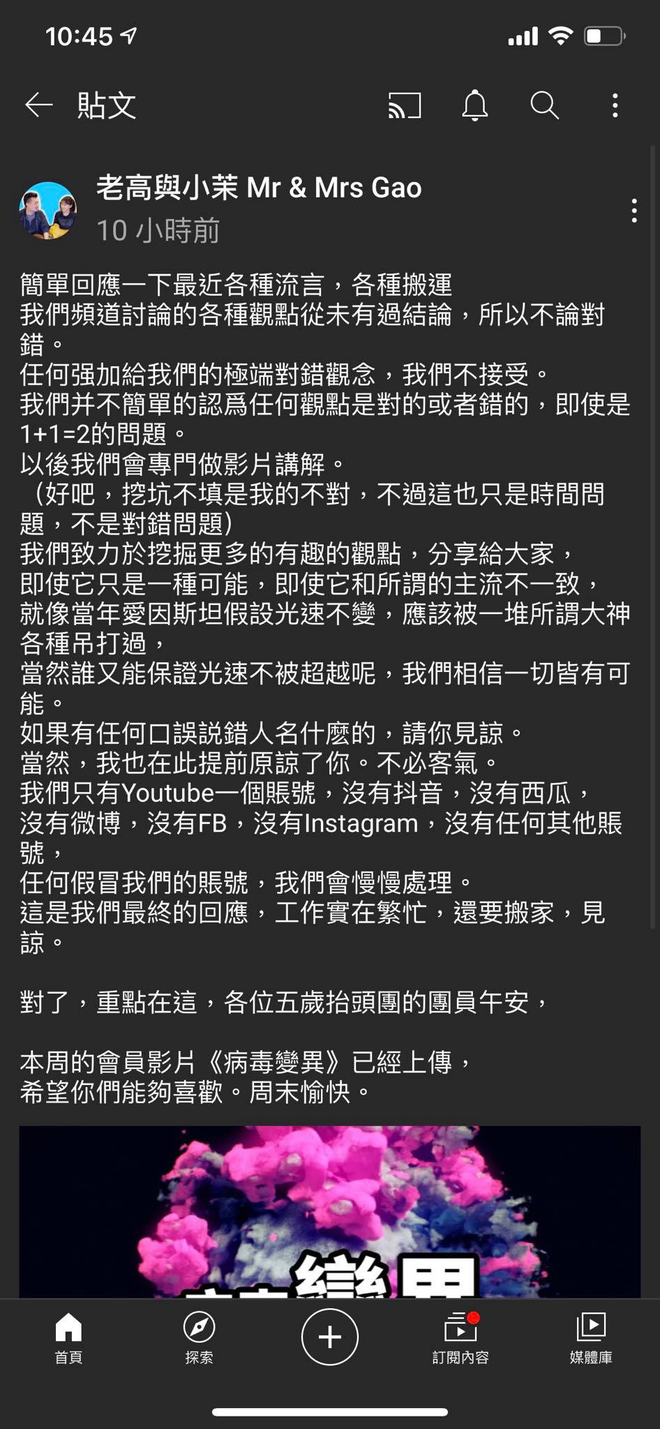 我們只有 YouTube 一個賬號,沒有抖音,沒有西瓜,沒有微博,沒有 FB,沒有 Instagram,沒有任何其他賬號,任何假冒我們的帳號,我們會慢慢處理。這是我們最終的回應,工作實在繁忙,還要搬家,見諒。