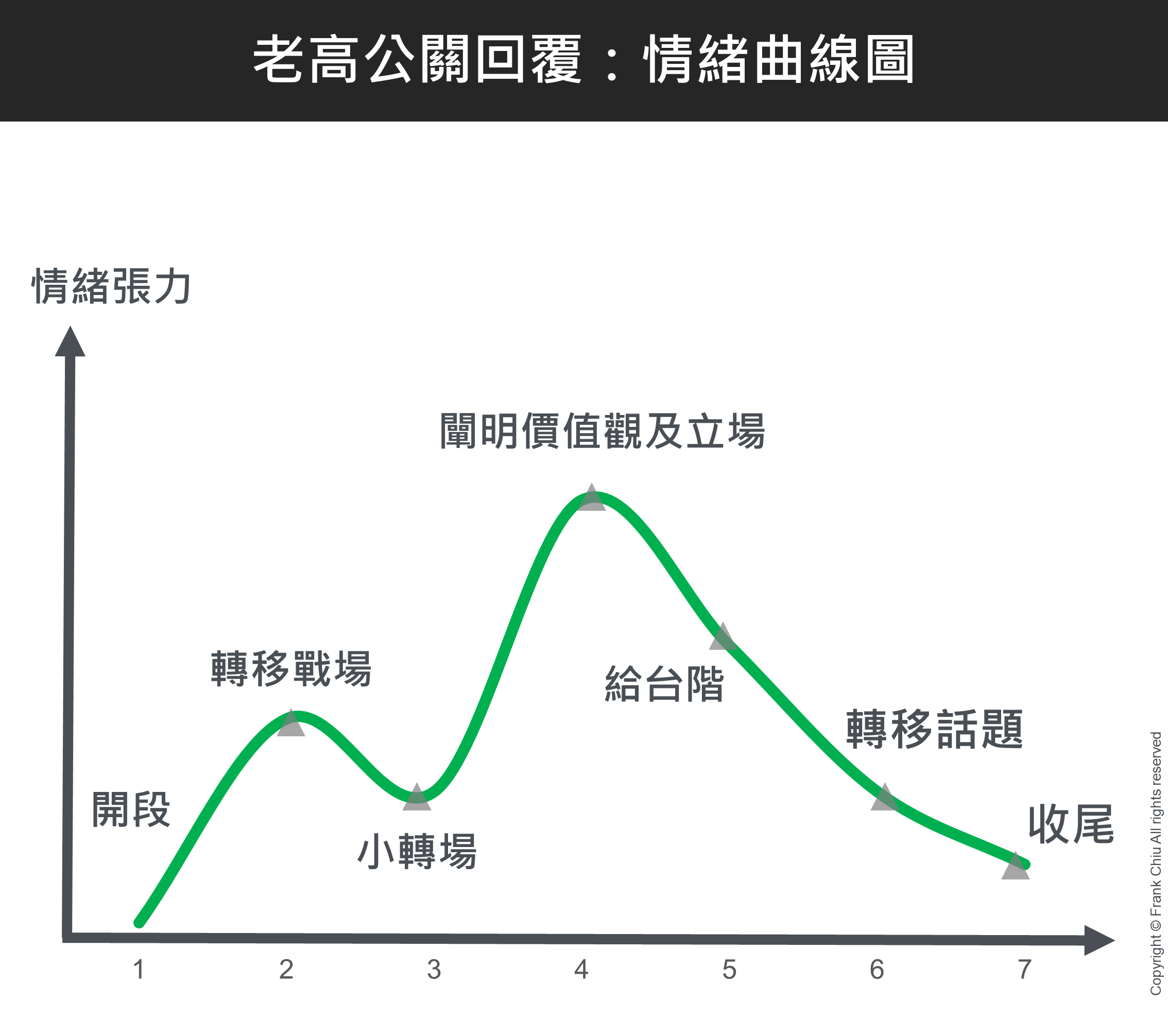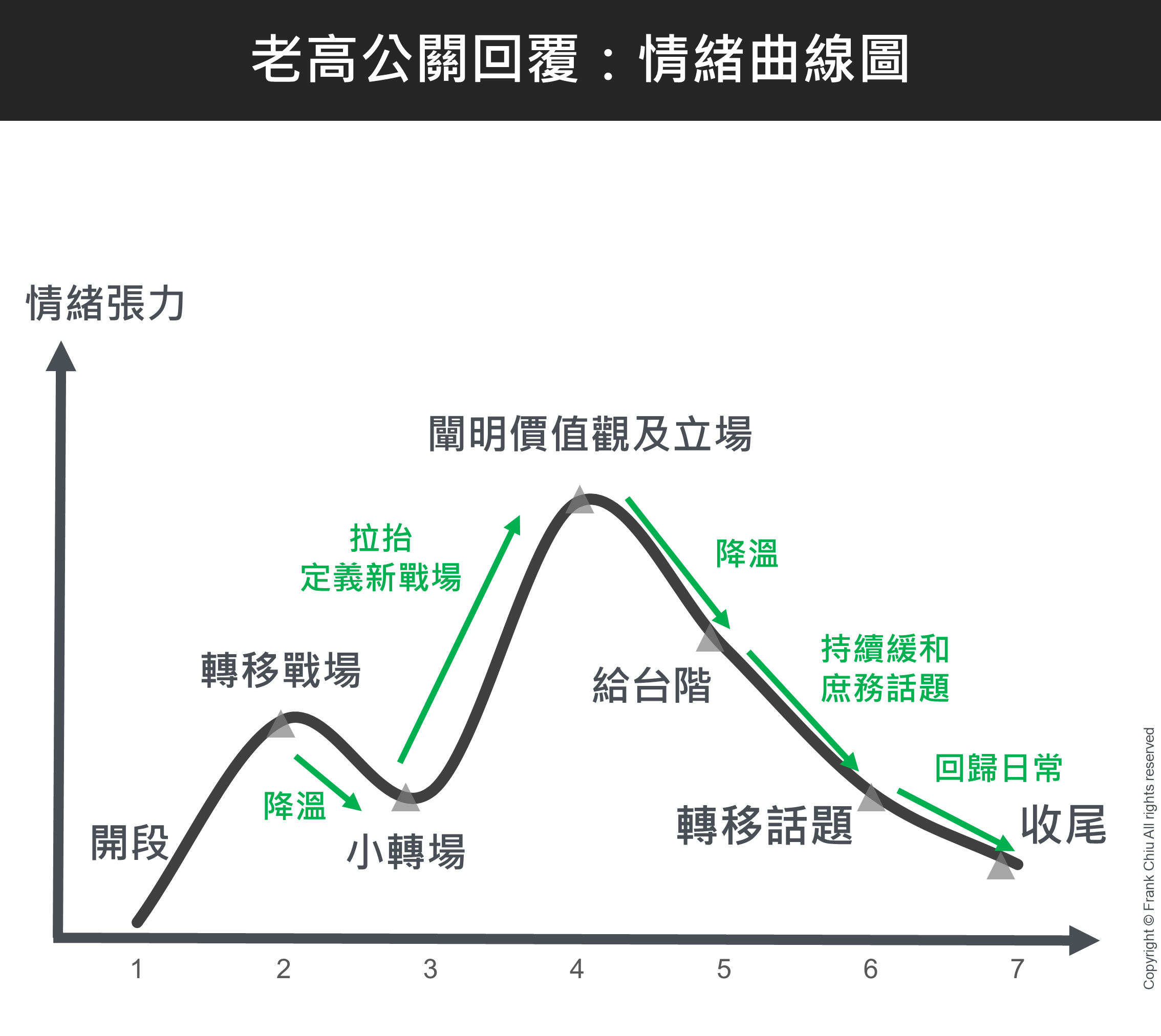 在闡明個人立場上,也有表明自己的價值觀的說明,讓情緒張力往上提升;另一方面,也有透過轉場、自嘲、轉移話題、給台階等作法,讓情緒張力冷卻。