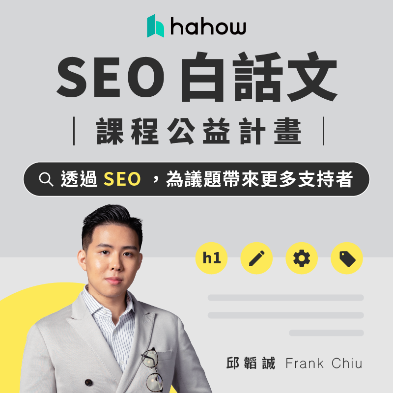 而這次很榮幸與 Hahow 共襄盛舉,免費提供 20 份《SEO 白話文》線上課程,給符合申辦資格的非營利組織的夥伴,希望能幫助您支持、努力的議題,能被更多人看到,持續擴大影響力。