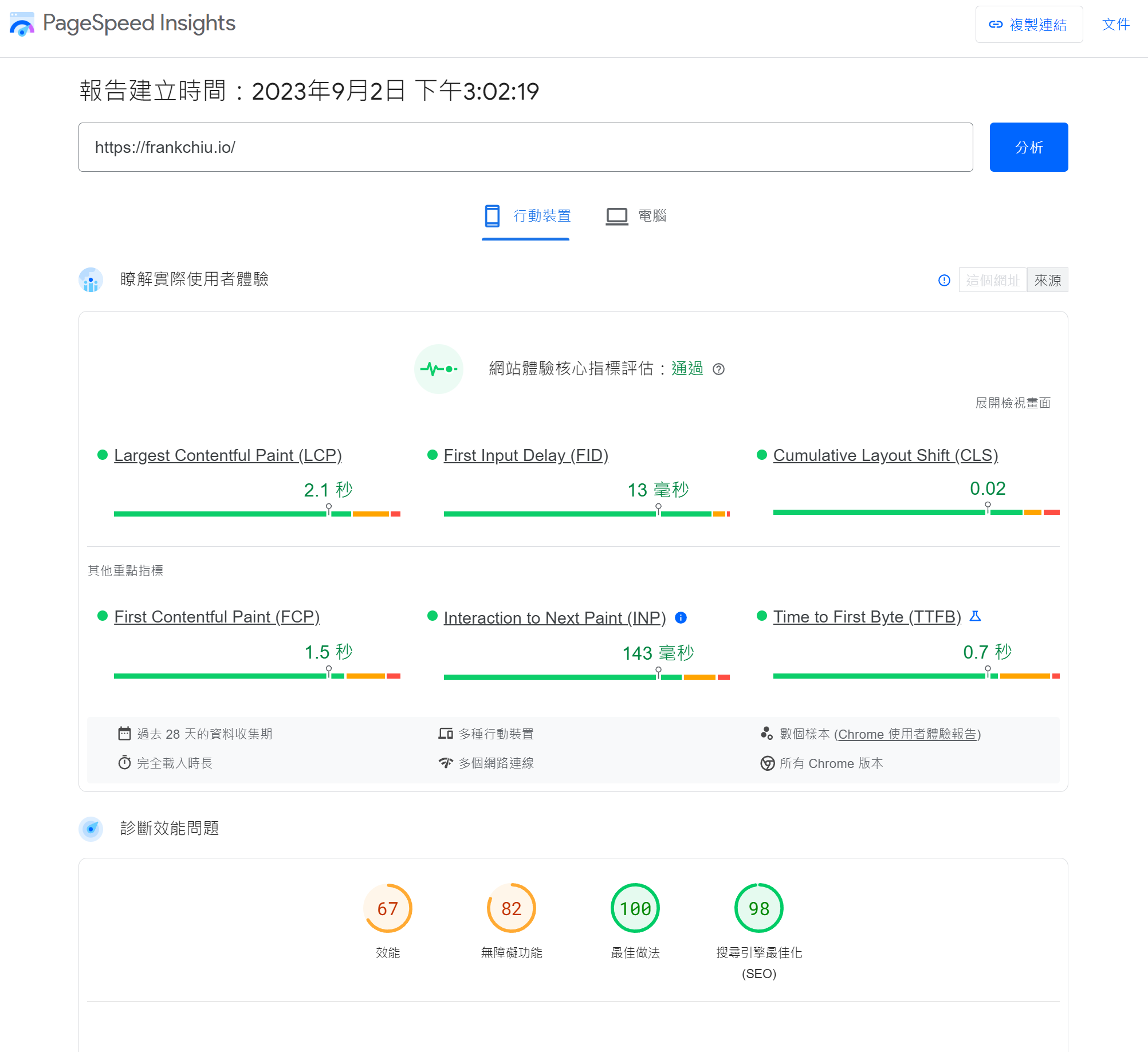 你只需要把網址丟進去,就可以看到桌面版跟手機版的網頁載入效能,記得多測幾個不同的網頁。其中手機版的速度重要性遠遠大於電腦版,而 Google 也會優先顯示手機版的資訊給你。