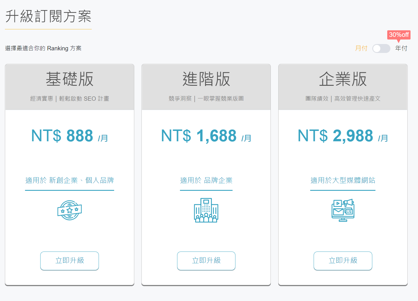 - 企業版:如果品牌的網站超大、目標關鍵字超多,就建議選擇企業版了
