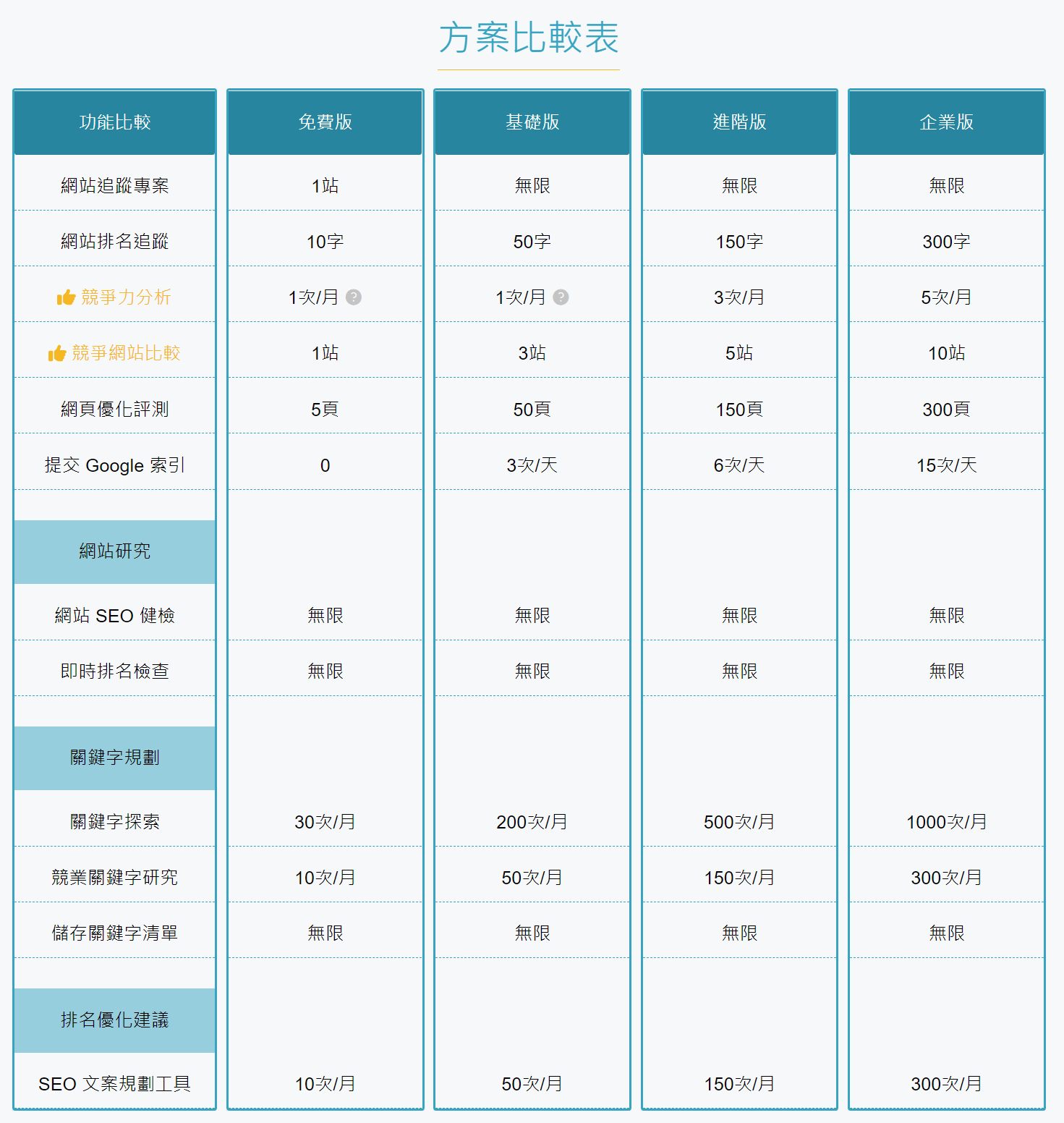 至於方案之間的差異,主要就是各功能的使用數量差異了,關鍵字追蹤數量、文案規劃工具使用數量、競爭力分析的差異。