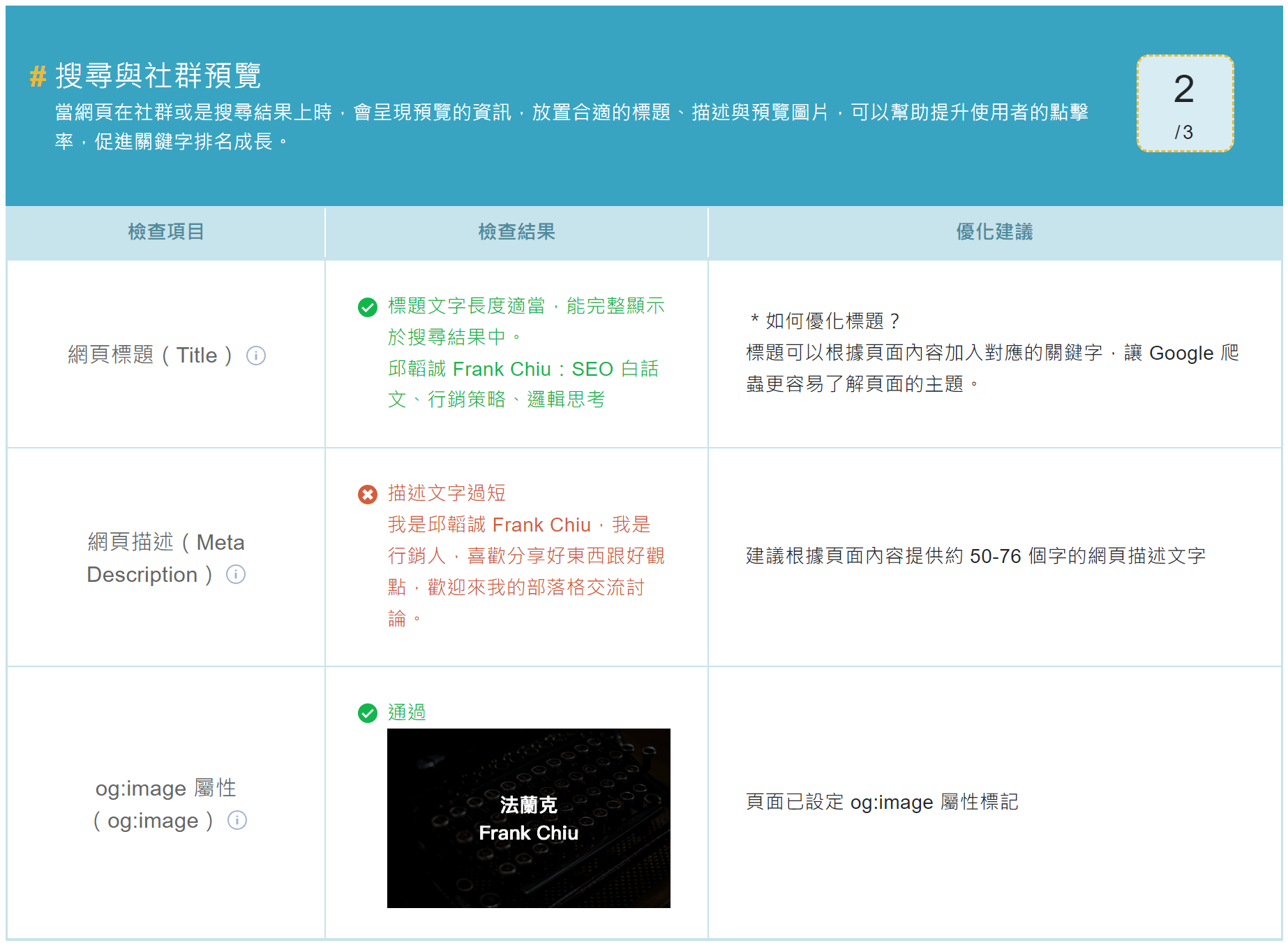 Ranking 的網站建檢功能是檢測網頁的 SEO 技術項目,像是該頁面有沒有 title、description、h1、alt、https……etc。 這些檢測項目都非常的必要,如果你哪一個項目沒有通過,Ranking 工具也會提供給你「優化建議」,這非常的實用。 好比說,我個人網站的首頁 descripition 被檢測出「描述文字過短」,Ranking 工具就提供優化建議:「建議根據頁面內容提供約 50-76 個字的網頁描述文字」。