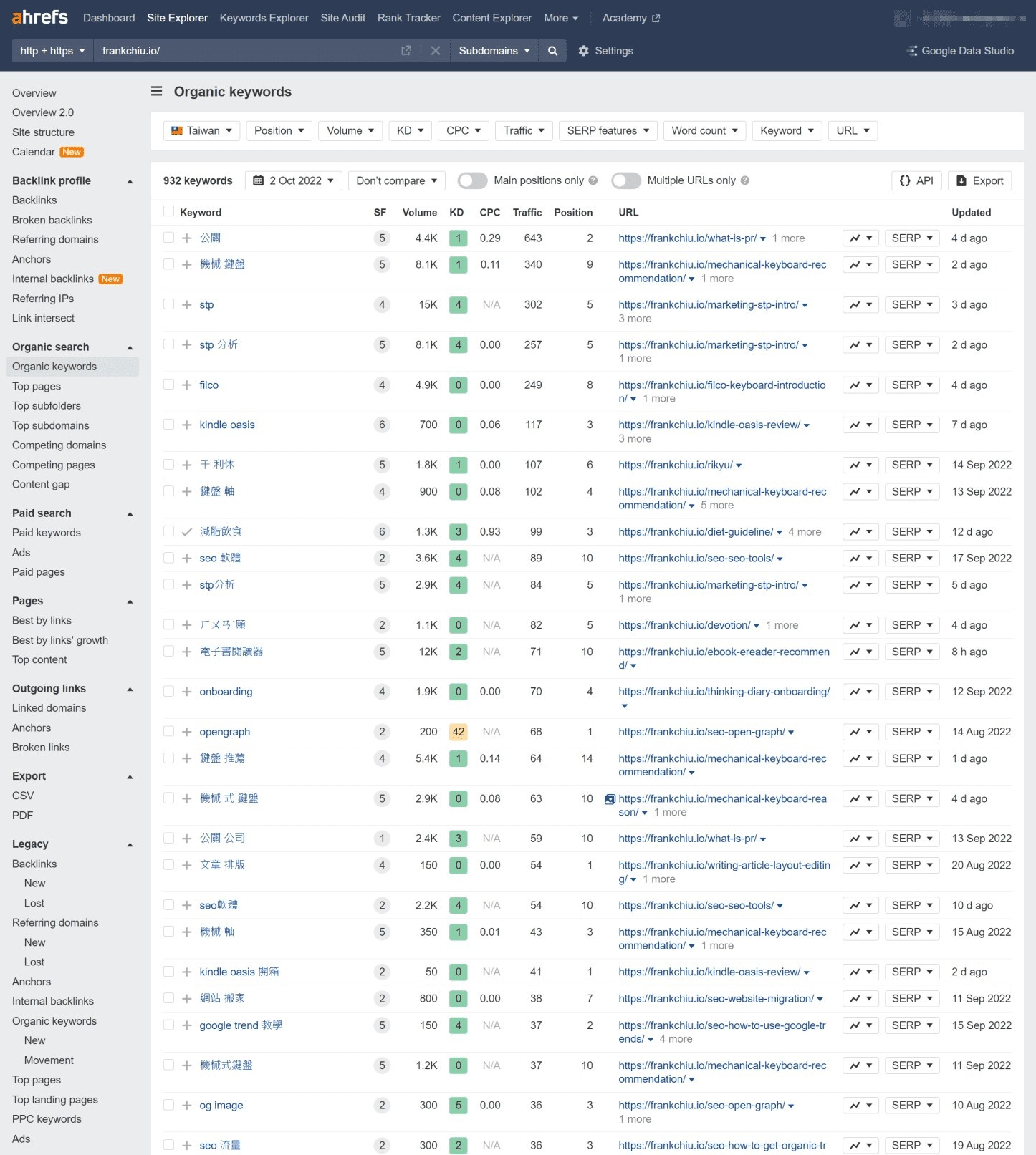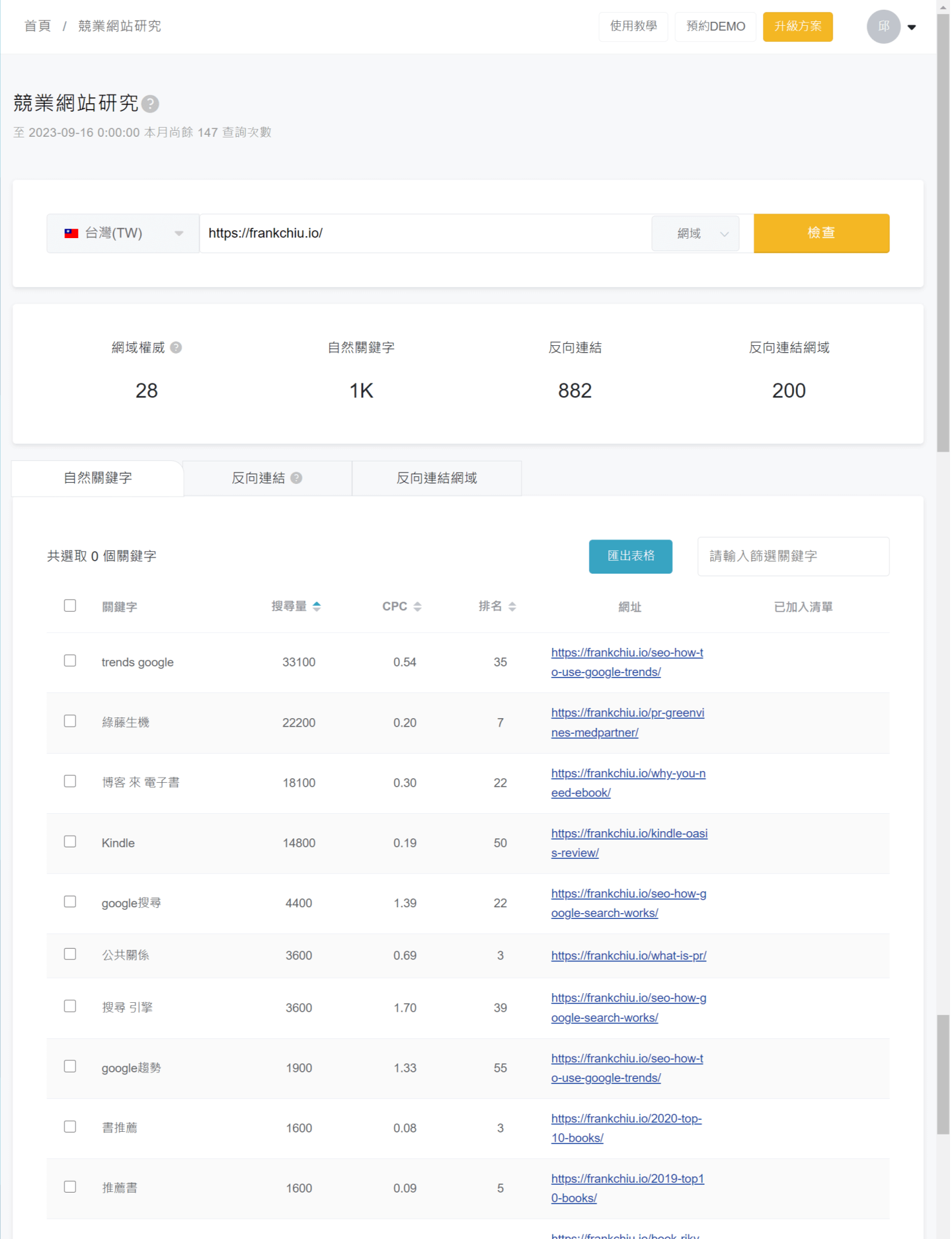 競品網站研究,顧名思義就是可以輸入競品的網址,系統會跑出來該網站的:主要關鍵字、反向連結。 這工具非常的重要,對於稍微有些專業的 SEO 人來說會非常受用,目前世界上把這個功能做的最理想的就是 Ahrefs,我對於 Ranking 能提供這樣的工具感到非常的驚喜;畢竟 Ahrefs 雖然好用,但真的太貴了,如果能用台灣本土的工具就做到類似的事情,那實在是大好事一件。 畫面中你可以看到,輸入了我的網址後,畫面中出現了我網站的關鍵字,排名跟搜尋量都是 OK 的,資料可參考。