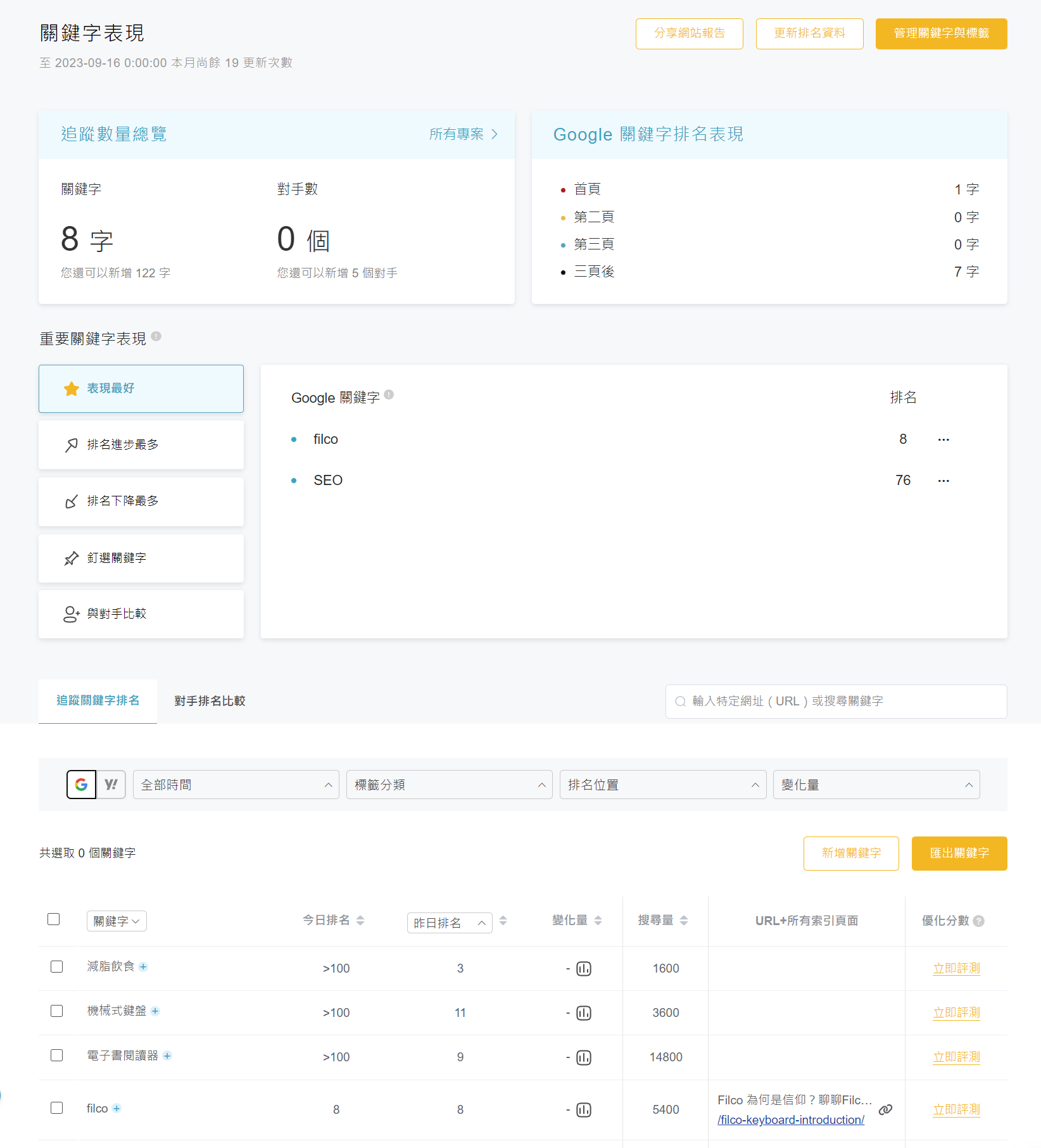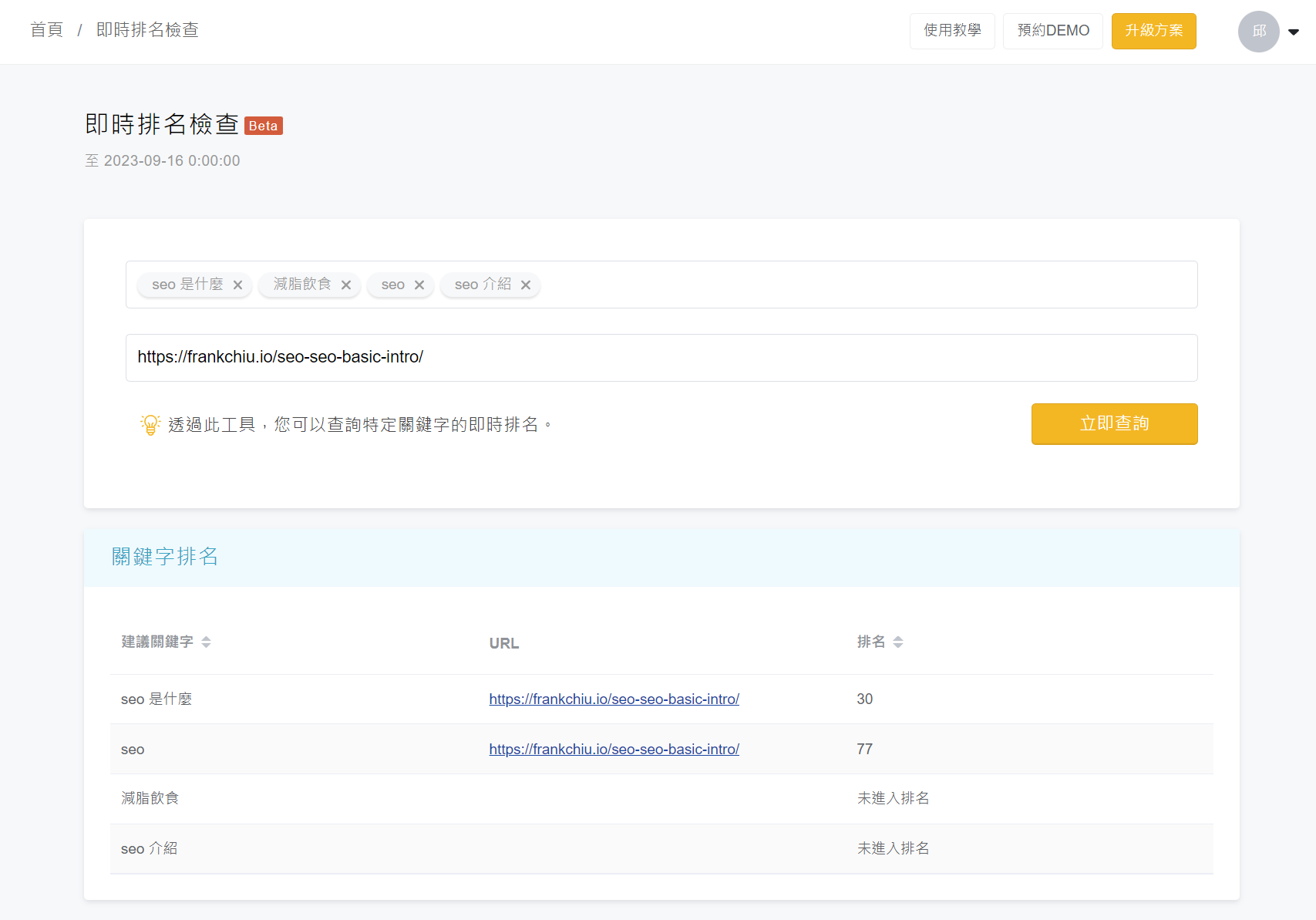 至於為何我會強調是「網頁健檢」而非「網站建檢」呢?因為像是 screaming frog 這類工具,會一次爬取整個網站的所有網頁,然後提供技術項目的檢測,對我而言這算是整個網站的健檢。(網站建檢) 而 Ranking 的網站建檢,則是針對你貼上去的那則 url 進行檢測,如果想要檢測整個網站,就需要針對比較多頁面進行抽樣檢測;儘管沒那麼完美,但我認為對於多數中小型的網站,這樣已經很有幫助了。排名追蹤:專案關鍵字排名追蹤