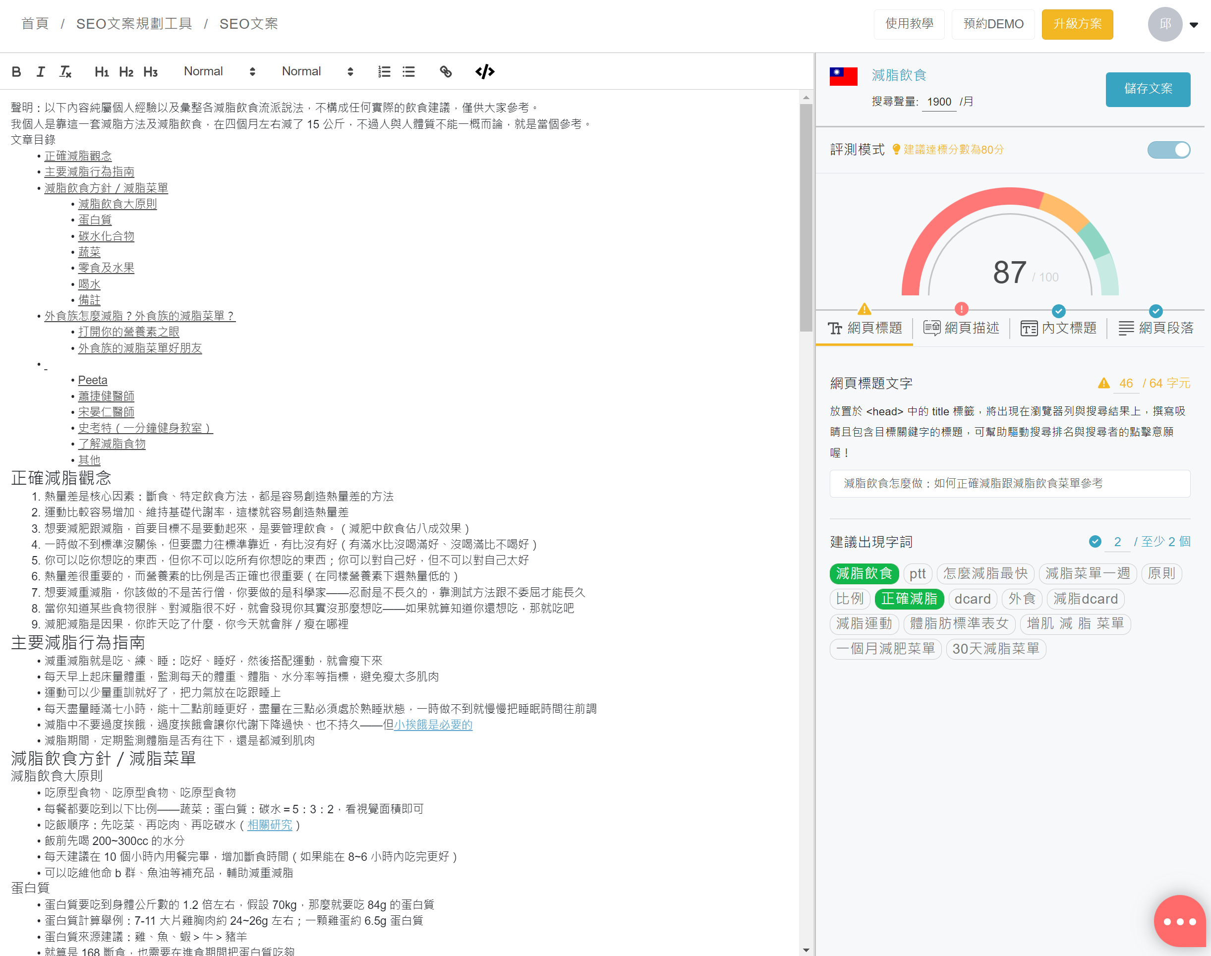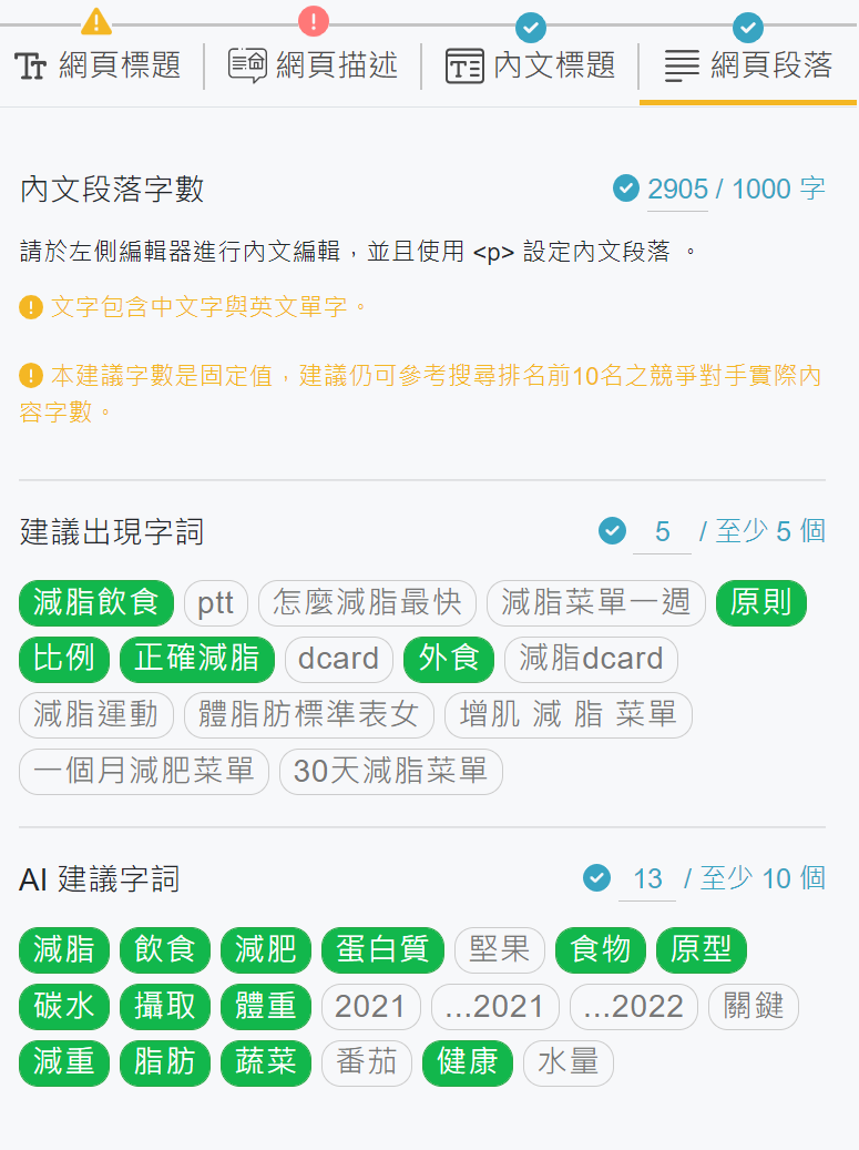 對於寫 SEO 內容還沒有太多手感的朋友,很推薦可以按照這樣的工具來做嘗試,久而久之就有手感了。
