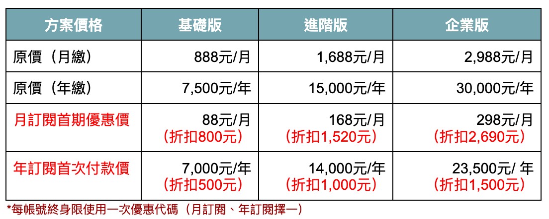 - 基礎版:適合新創、個人品牌,事業剛起步的朋友