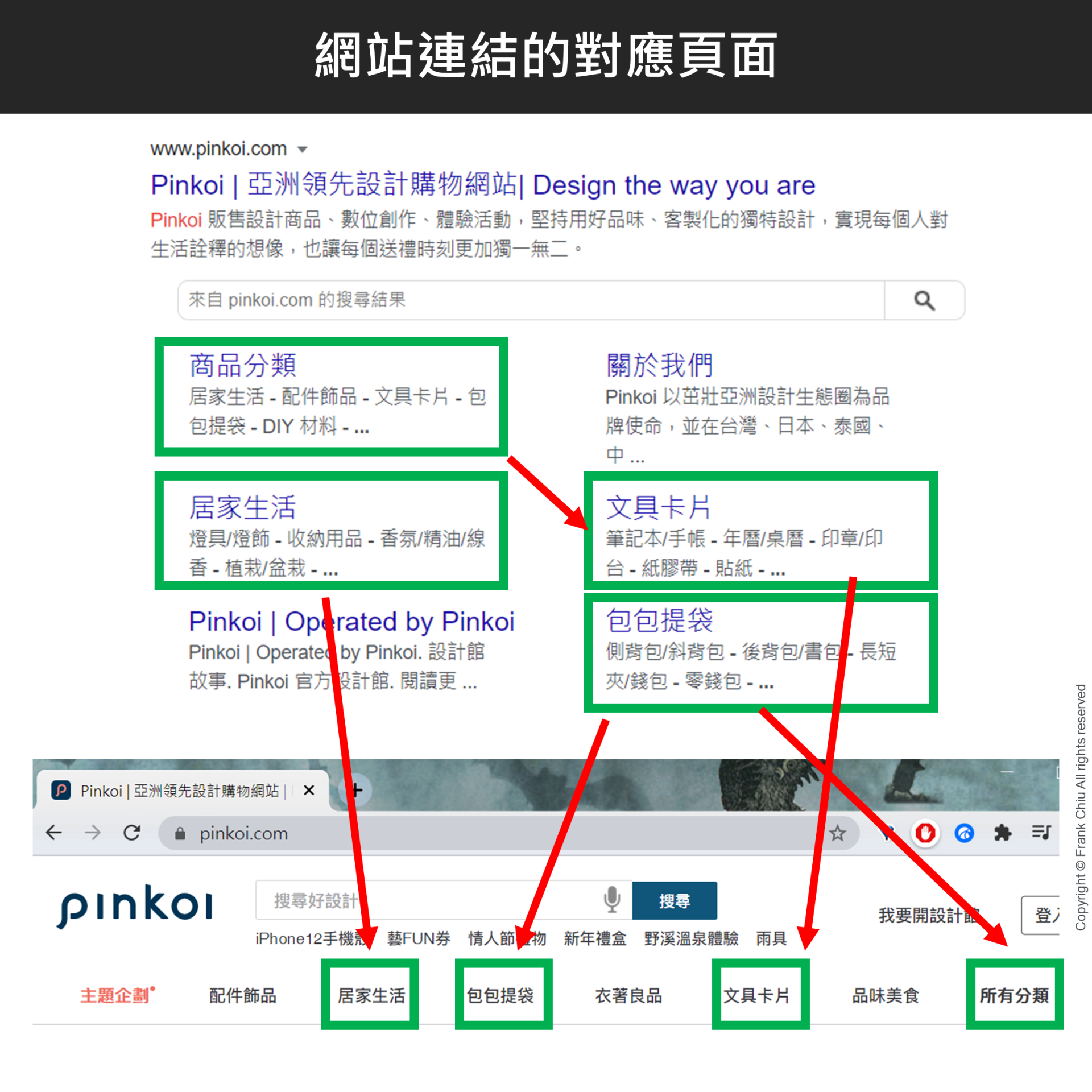 下面我以 Pinkoi 為例,你會發現網站連結上的連結頁面,大多都是網站裡面的大分類頁,並且多數都在導航列(navigation bar)上面。